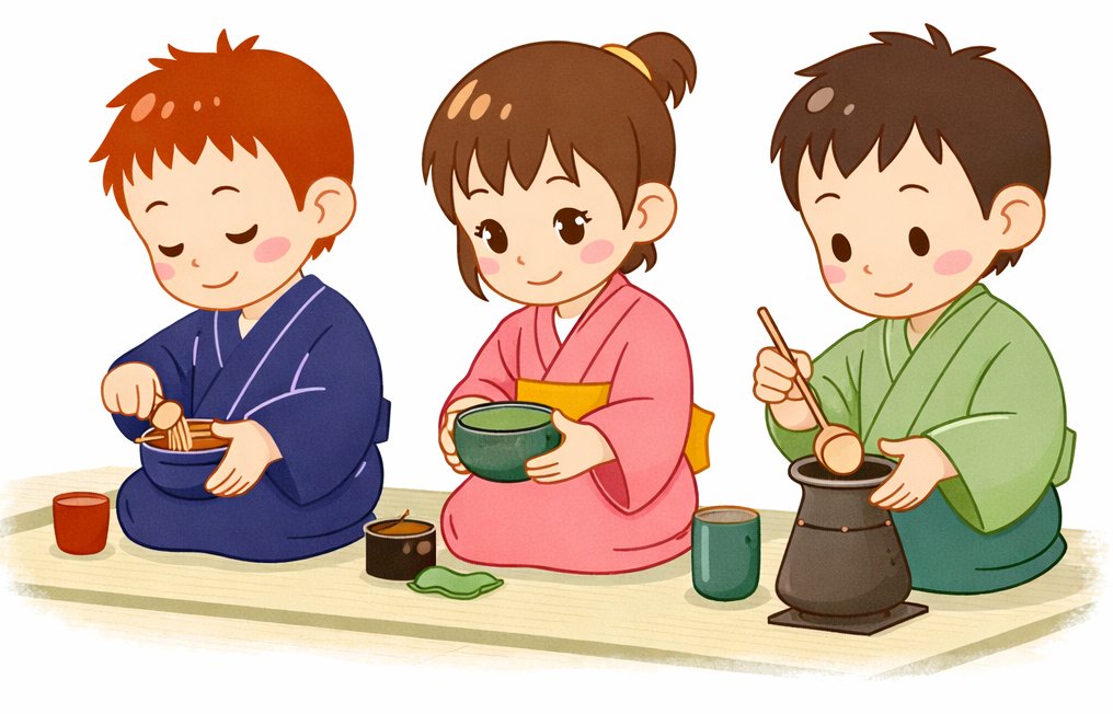 年長クラスでは、年数回のお茶のお作法を学ぶ時間を設けています。静寂の中で日本文化の一端にふれる心静かなひとときです。茶道体験は、心の落ち着きや美しい心遣いを育む貴重な機会です。